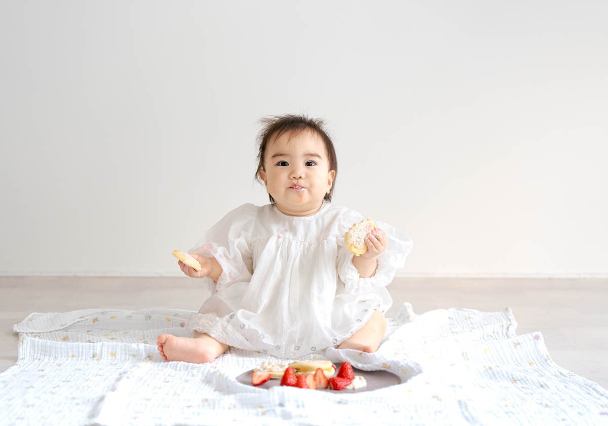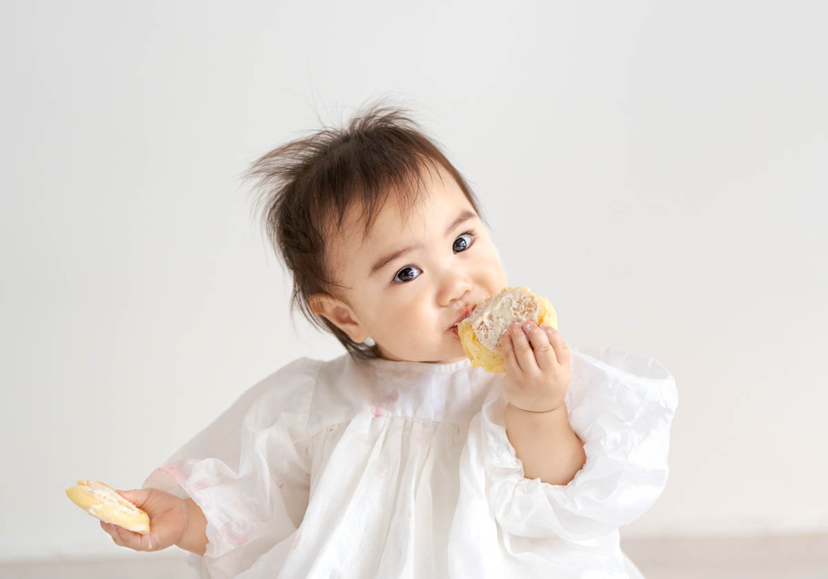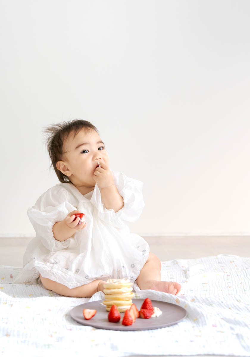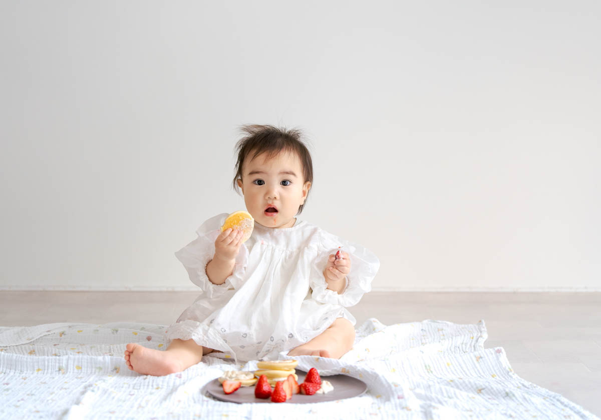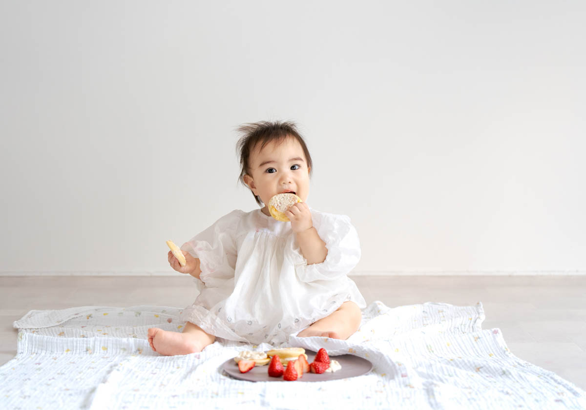 一方で、食べられるものが増えてくることで、楽しいよりも空腹が勝つこともあります。そのため撮影中おやつを食べると、にこにこ元気にになる子も多くいます。食べることが好きな子は食べ物の撮影もとってもかわいいです。