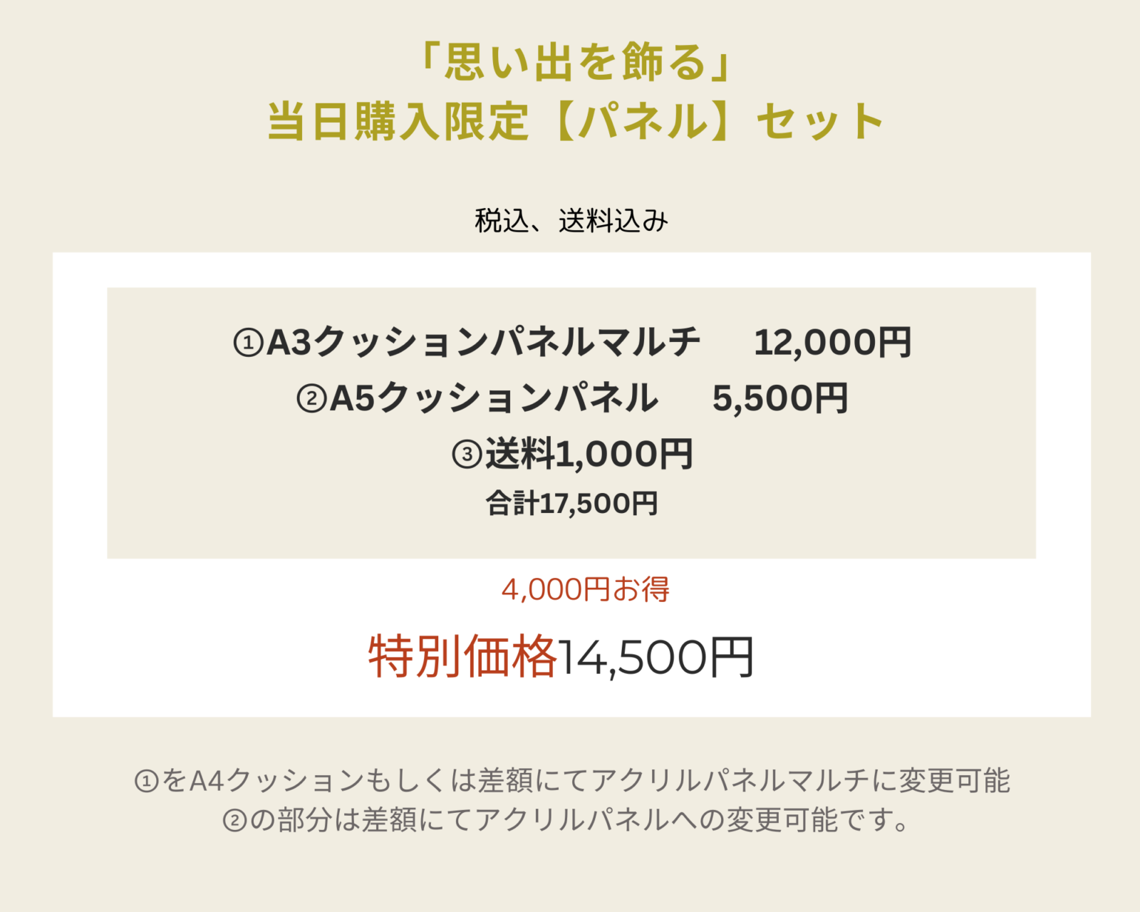 | 、クッションパネルマルチ | 写真最大4枚 | A3、A4 | 写真を3枚もしくは4枚レイアウトできます。 | 11,000円 |