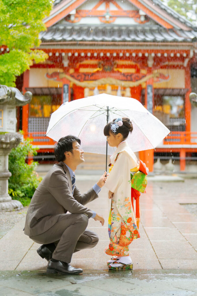 雨が大好きな子が多いです。七五三では傘や長靴をご用意ください。