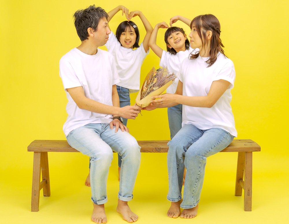 大きな白い壁と大人4人が座れる大きなベンチがGoPhotoスタジオのトレードマークです。
